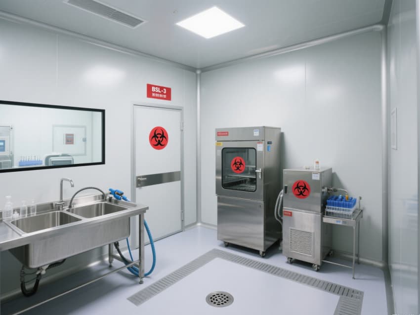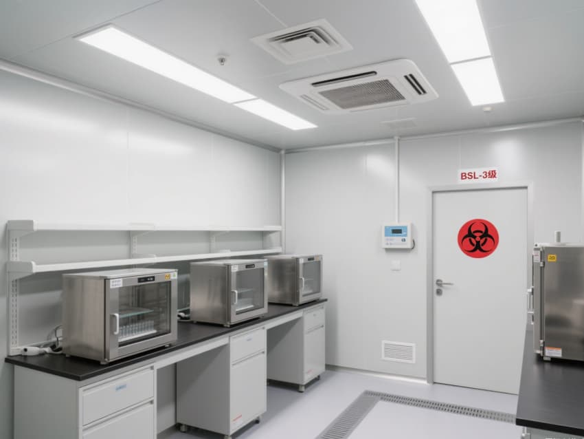 實驗室核心區域配備負壓生物安全柜、雙扉高壓滅菌器,確保微生物操作與廢棄物處理安全;頂部高效空氣過濾器(HEPA)實現每小時15-20次空氣置換,尾氣經消毒處理后排放,避免氣溶膠擴散。互鎖式潔凈門、雙層鋼化玻璃觀察窗與應急噴淋裝置,形成全流程安全保障。?