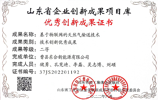 水發(fā)能源曹縣東合公司榮獲山東省企業(yè)創(chuàng)新成果項目庫“技術創(chuàng)新優(yōu)秀成果二等獎”