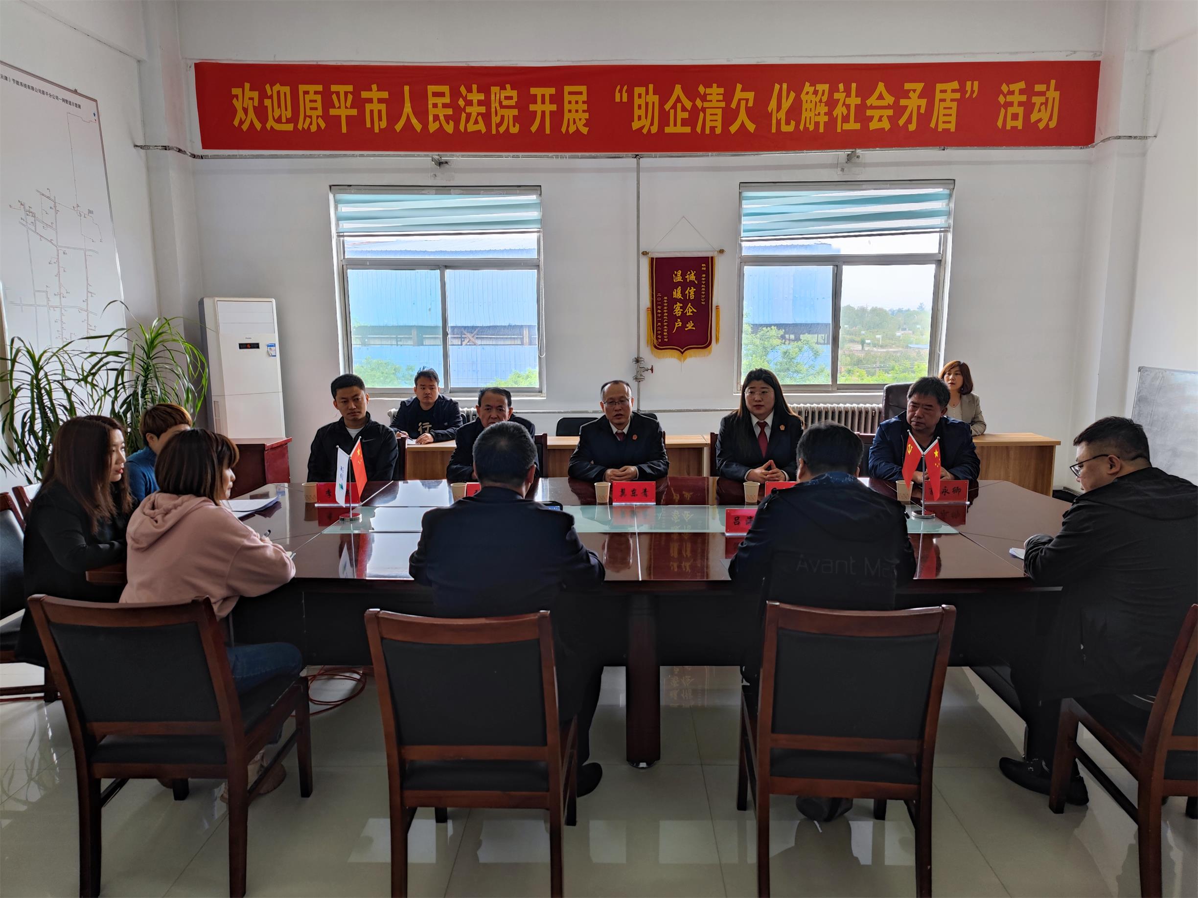 5月12日上午,水發能源盾安原平分公司邀請原平市人民法院審判委員會專職委員、立案庭庭長冀東青一行,就企業經營中存在的用戶欠繳熱費問題,進行專題調研,開展為期兩天的“助企清欠、化解社會矛盾”活動,協調解決企業有關訴求,全面優化營商環境,幫助企業紓困解惑、促企發展。