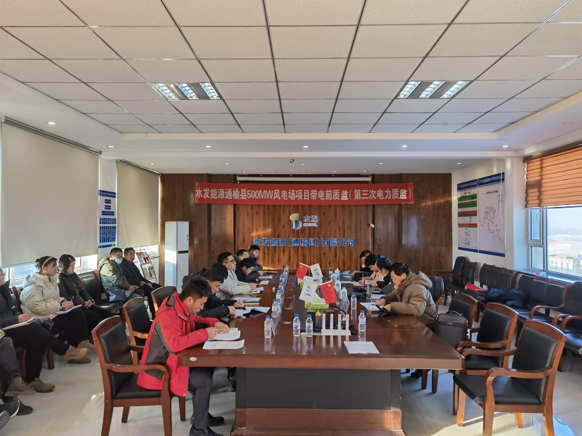 12月23日,可再生能源發電工程質量監督站專家組蒞臨水發能源通榆縣500MW風電場項目,開展升壓站受電暨首批風電機組啟動試運前質量監督檢查工作。水發能源通榆公司、設計單位、監理單位、總包單位及各施工單位積極配合檢查。