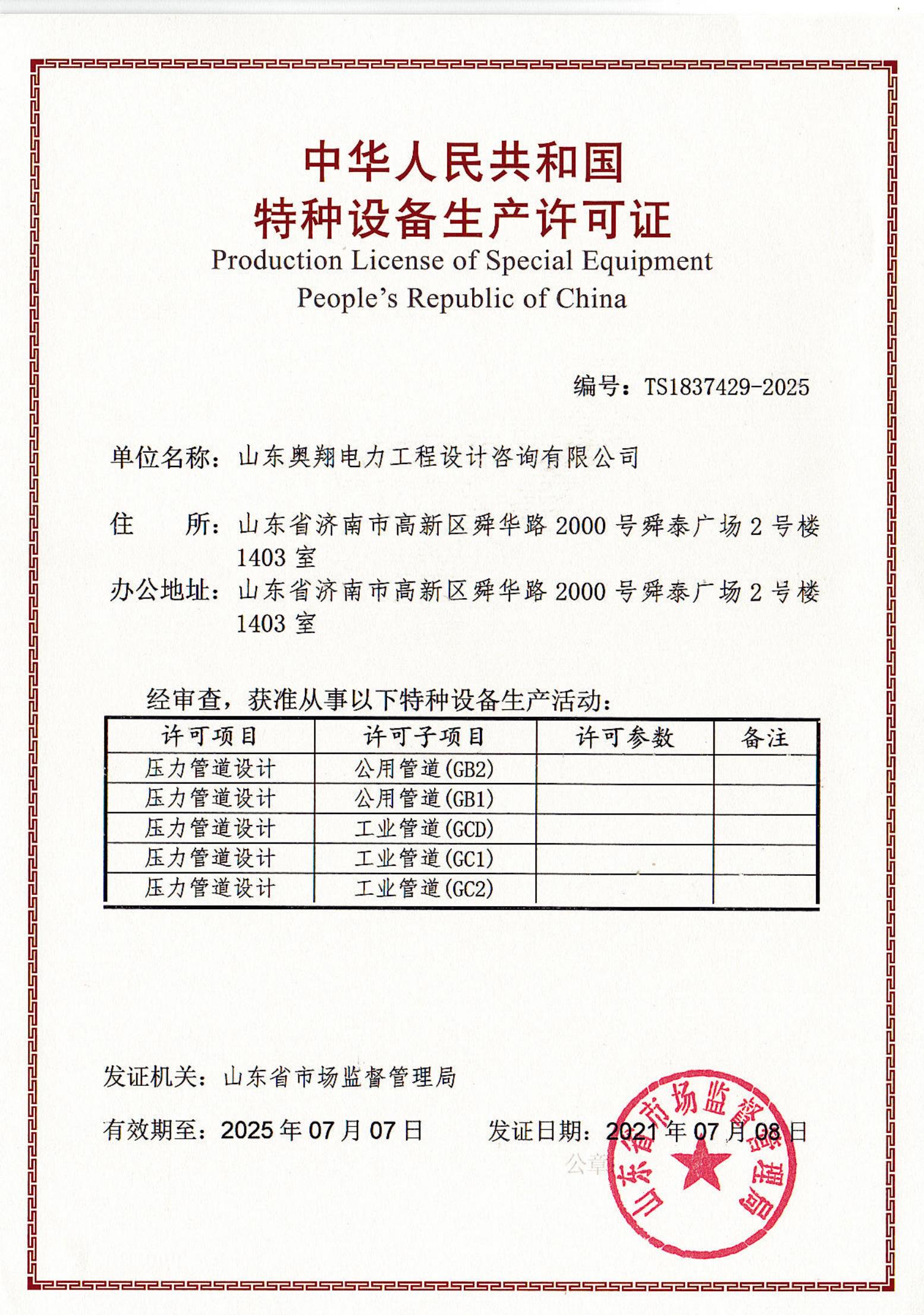 近日,在山東省市場監(jiān)督管理局最終審核后,山東奧翔完成了特種設(shè)備設(shè)計許可證書換證工作,實現(xiàn)了GB1,GB2,GC1,GC2,GCD級別壓力管道設(shè)計特種設(shè)備許可證的延續(xù)。